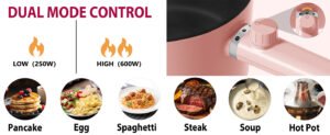 •【Ideal Capacity & Handle Design】This 1.5L electric cooker is ideal for 1-2 people. With a diameter of 7.08 inch and a depth of 5.12 inch, this electric pot ensure you plenty of space to cook ramen, hot pot, sauté and stir-fry. This frying pan has a long handle design to ensure comfortable grip when picking up the cooker, make frying and cleaning easier.